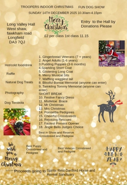 You thought dog show season was over. Ho ho ho no! Join the indoor Christmas dog show, with 18 fun classes. With food and drinks available, photography and activities. Proceeds are going to Spirits Rest Dartford Horse and Animal Sanctuary.