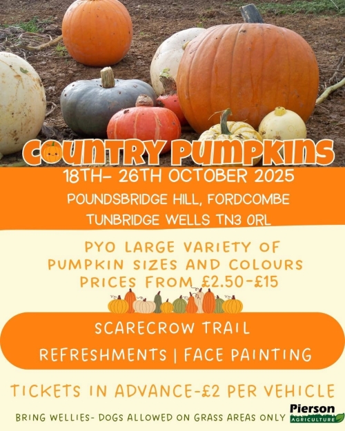 Pick Your Own (PYO) Pumpkins 18th to 26th October 2025. Dogs allowed in the grassy area but not in the PYO Pumpkin area. Must buy vehicle tickets in advance. Scarecrow Trail. Face painting. Refreshments.