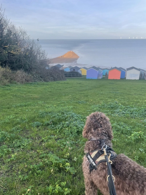 Pictured here Toby dog on the green space behind the colourful beach huts just across from Whitstable Castle where we'd enjoyed tea and cake (me) and a natural dog treat (Toby) from the Whitstable Castle downstairs cafe where dogs are welcome on the wooden floor area.