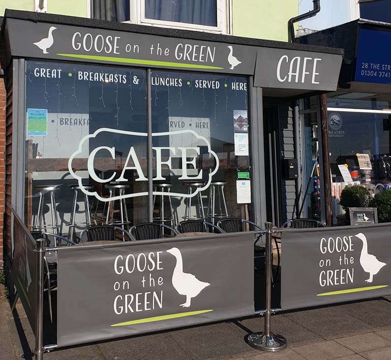 Goose on the Green cafe has excellent reviews and is dog-friendly inside and also has outside seating if you prefer. Sounds great!