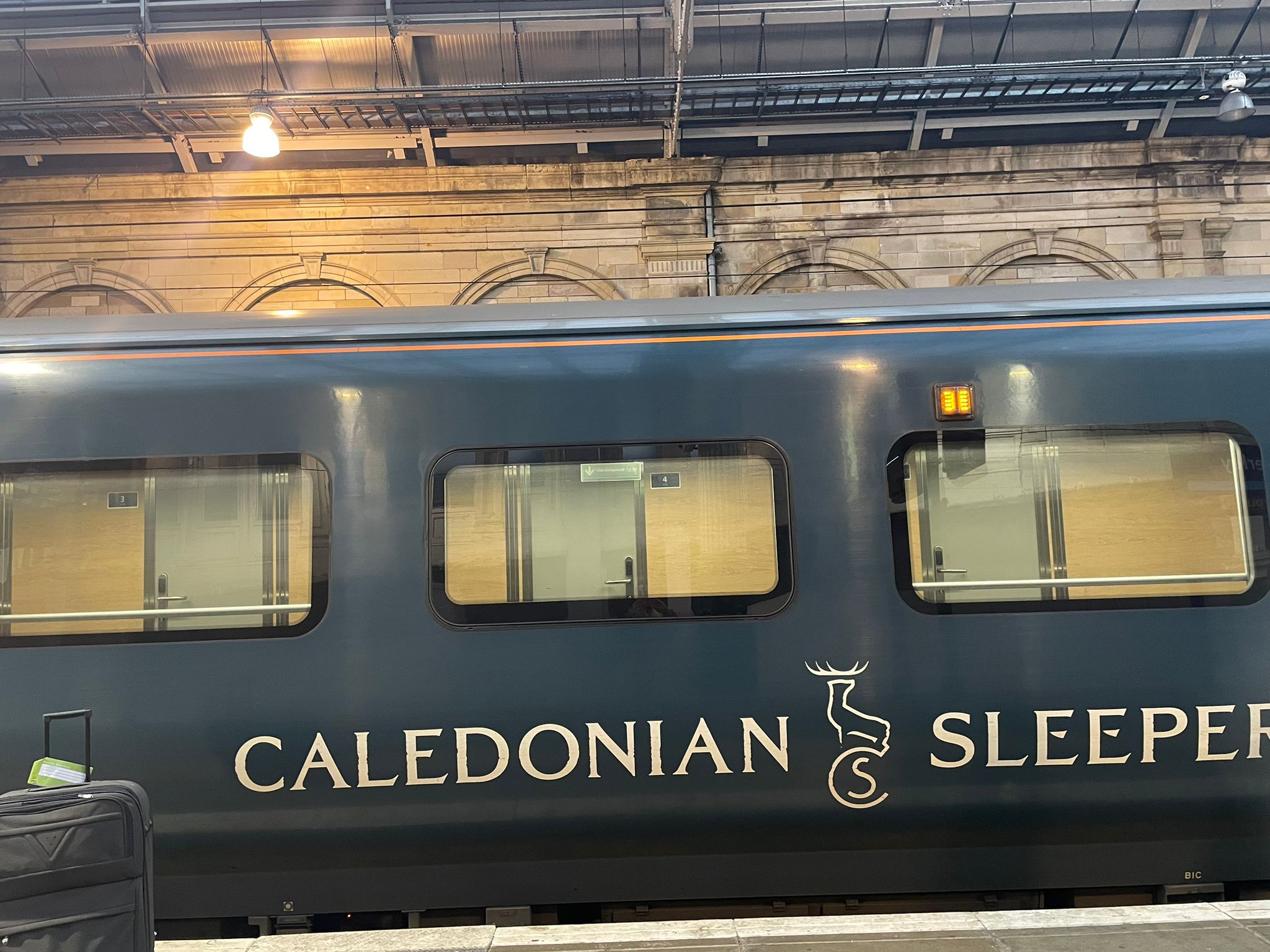 Up to 2 dogs can travel in a sleeper cabin with you for £30 per journeySo public transport tends to be very dog-friendly and the Caledonian Sleeper is no exception. We got the train from Sittingbourne to St Pancras then walked to London Euston (good opportunity for doggy toilet break!). There are some green space squares in the area, have a look on Google Maps Tavistock Square or Gordon Square for example.