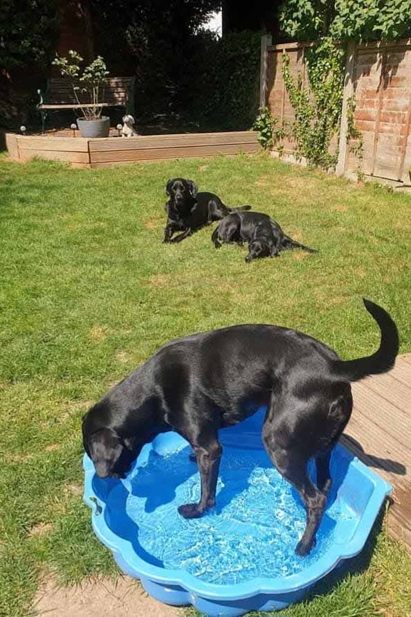Cooling paddling pool at Family Dog Services HQ for Dude, Rose and GenieAs trainers we take the welfare of the dogs training with us very seriously and we always rearrange 121s and classes if we feel the dogs are at risk