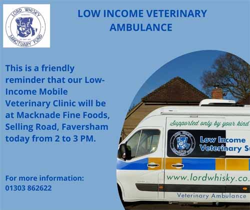 The Lord Whisky Sanctuary Fund Kent run low income mobile veterinary clinics normally every other week in the Macknade Faversham Kent car park.